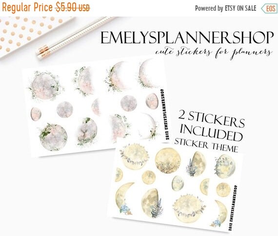BLACK FRIDAY SALE Moon Phases, Planner Sticker Set, Celestial Sticker, Moonlight Nature, Soft Watercolor, Bujo Sticker, Bullet Journal Kit 2 by EmelysPlannerShop