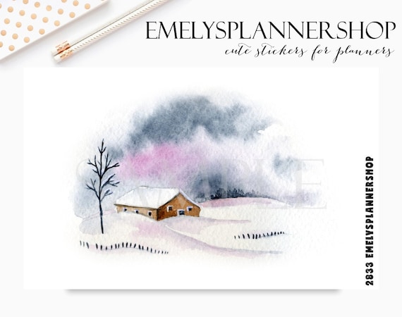 Winter Landscape, Scene with Snow, Rustic House, Snowy Forest, Watercolor Stickers, Planner Stickers, Bujo Sticker, Bullet Journal Kit 2833 by EmelysPlannerShop