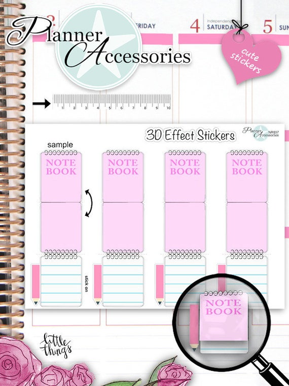 Decorate with this Cute 3D Notebook Planner Stickers your Live Planner, Erin Condren, Happy Planner, Filofax or Kikki K. with our unique designed functional Stickers. Cute Planner Accessories that will transform your daily planner from ordinary to extraordinary! These kawaii stickers are a perfect way to put a personal twist to your professional planner. Stay organized while staying colorful and stylish!