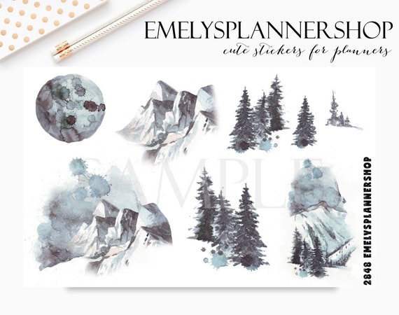 Mystery Mountains, Winter Landscapes, Forest Wood, Snow Scenes, Watercolor Stickers, Boho Stickers, Bujo Sticker, Bullet Journal Kit 2848 by EmelysPlannerShop