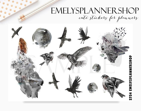 Fantasy Dreams - Halloween Stickers - Ravens and Birds - Mystery Girl - Watercolor Art - Boho Stickers - Bujo Sticker 2754 by EmelysPlannerShop