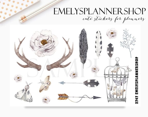 Skulls and Feathers - Arrows and Flowers - Watercolor Stickers - Boho Stickers - Bujo Sticker 2747 by EmelysPlannerShop