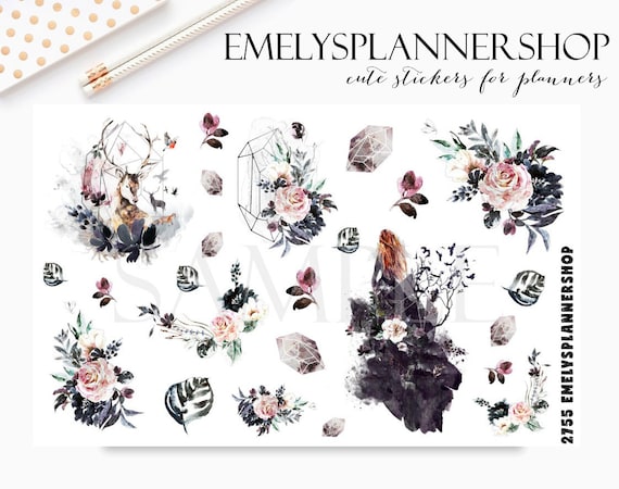 Bohemian Fantasy - Roses and Floral - Mystery Girl - Watercolor Art - Boho Stickers - Bujo Sticker 2755 by EmelysPlannerShop