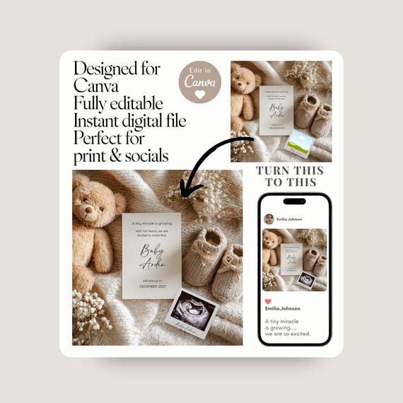 Neutral boho pregnancy announcement for Instagram and social media. Fully editable Canva template for your baby reveal post.