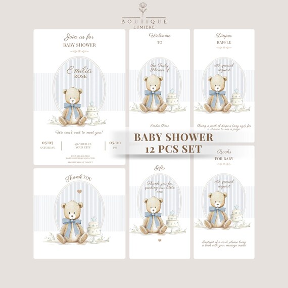 Editable Baby Shower Set • Canva Templates • Blue & Blush Teddy Bear • Invitation • Diaper Raffle • Books for Baby • Welcome Signs by BoutiqueLumiereCo