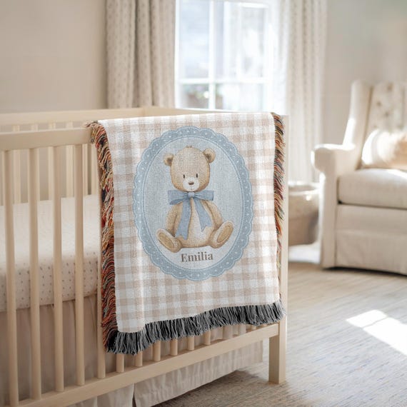 Personalized Teddy Bear Blanket • Blue Gingham Woven Name Blanket • Custom Baby Boy by BoutiqueLumiereCo