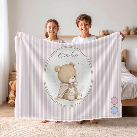 Personalized stripe baby blanket with fine-art brown bear and custom name. Choose baby pink or baby blue. Elegant neutral newborn gift & nursery decor.