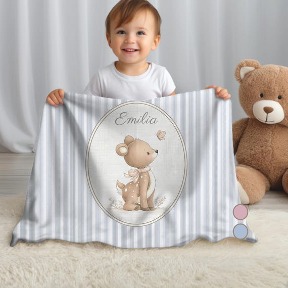 Personalized stripe baby blanket with fine-art deer and custom name. Choose baby pink or baby blue. Elegant neutral newborn gift & nursery decor.
