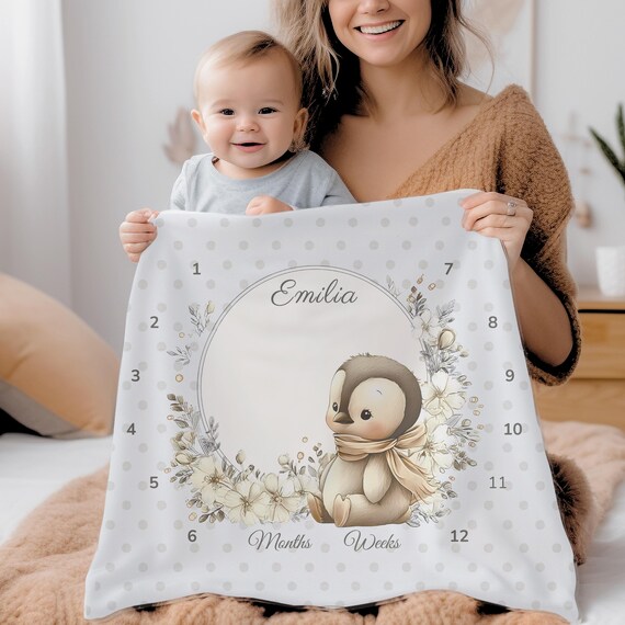 Floral Milestone Baby Penguin Blanket • Personalized Blanket • Monthly Baby Photo Mat • Pink or Blue • Newborn Gift • Woodland Friends by BoutiqueLumiereCo