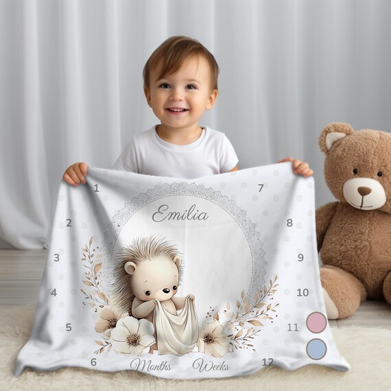 Floral Milestone Blanket • Personalized Hedgehog Blanket • Monthly Baby Photo Mat • Pink or Blue • Premium Newborn Gift • Woodland Animal by BoutiqueLumiereCo