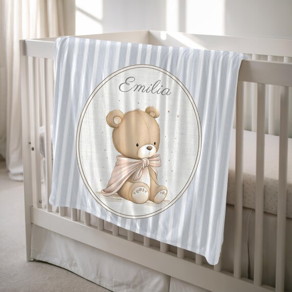 Personalized Bear Blanket • Stripe Name Design • Cozy Neutral Woodland Baby Blanket by BoutiqueLumiereCo
