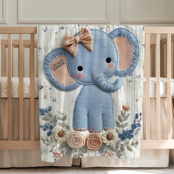 This embroidered-look baby blanket features a peaceful elephant surrounded by pastel stitched florals in blush, cream and dusty blue. A gentle, neutral design for modern nurseries — cozy for cuddles, beautiful for decor, and ideal as a boutique baby gift.