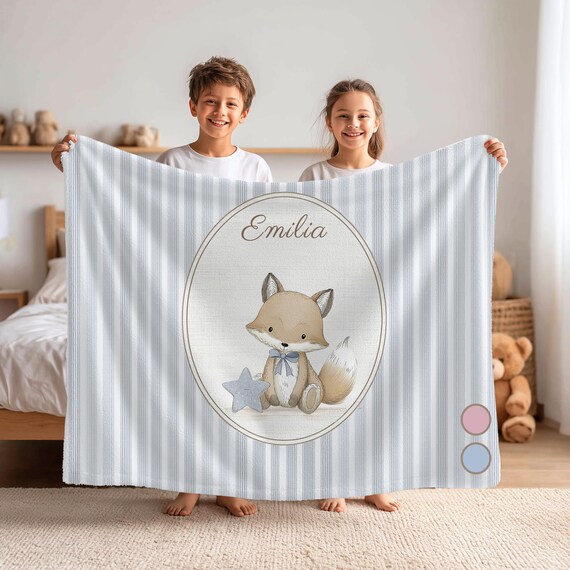 Personalized Fox Baby Name Blanket • Woodland Baby Blanket • Stripe Custom Baby Gift • Baby Pink or Blue Nursery Decor by BoutiqueLumiereCo