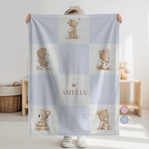 Personalized woodland patchwork baby blanket with soft pink or blue polka dots and a custom name. Gentle fine-art animal illustration for modern nursery decor.